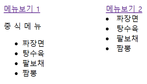<!DOCTYPE html> <html> <head> <meta charset="UTF-8"> <title>Insert title here</title> <style type="text/css"> div{ float: left; width: 200px; height: 300px; margin: 10px; } </style> <script src=../js/jquery.js type="text/javascript"></script> <script type="text/javascript"> $(function(){ $('#menu1').click(function(){ $('#message1').load('menu.html'); }); $('#menu2').click(function(){ $('#message2').load('menu.html li'); }); }); </script> </head> <body> <div> <a href="#" id = "menu1">메뉴보기 1</a> <span id = "message1"></span> </div> <div> <a href="#" id = "menu2">메뉴보기 2</a> <span id = "message2"></span> </div> </body> </html>